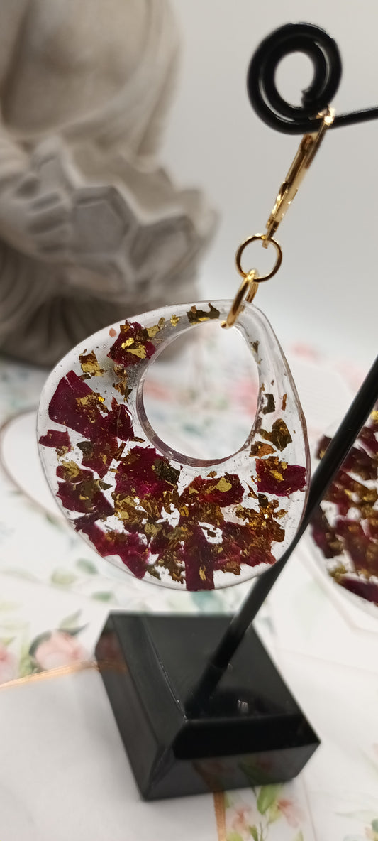 Boucles d'oreilles pendantes en résine fleurs ,inclusion de paillettes rouge