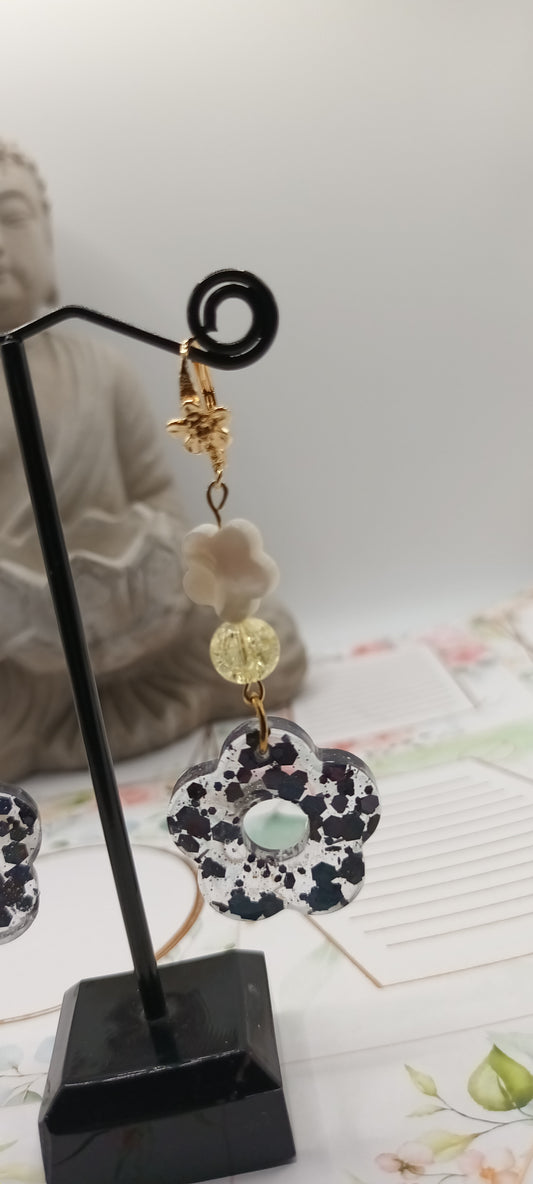 Boucles d'oreilles pendantes marguerite fleurs en résine , inclusion de paillettes noir