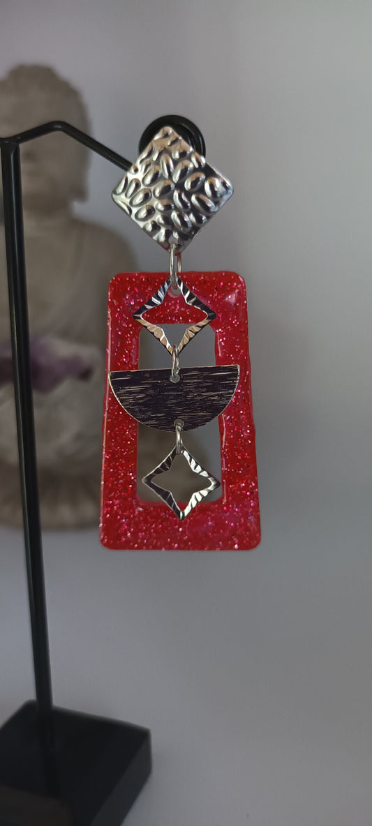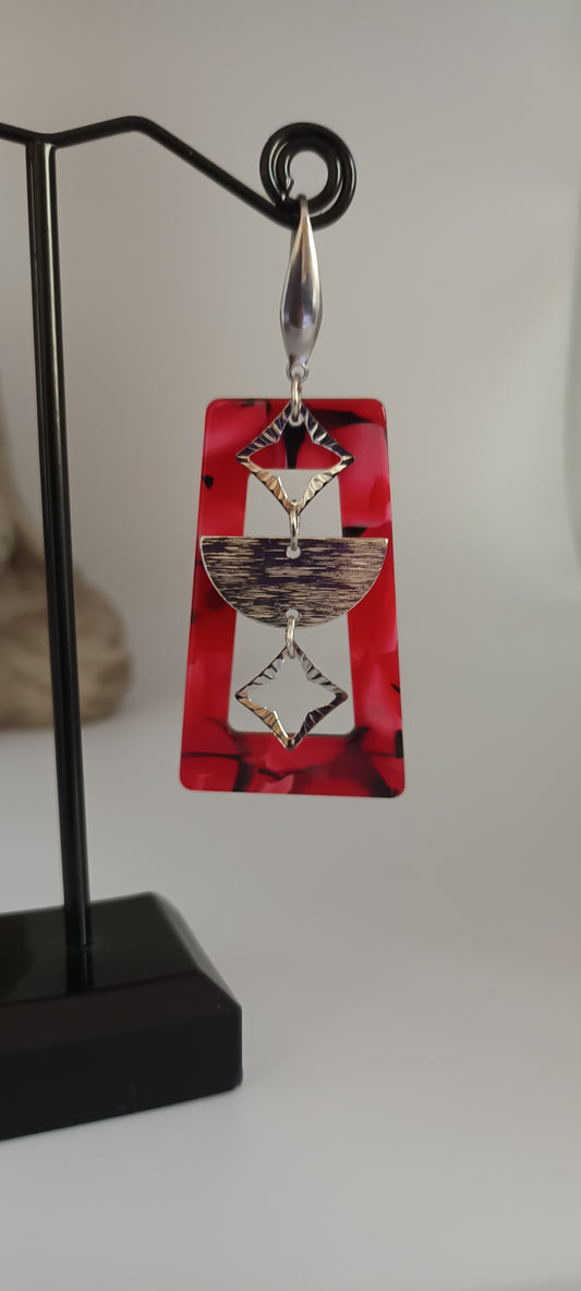 Boucles d'oreilles en acétate en forme de trapèze rouge et noir, demi lune et losange au centre