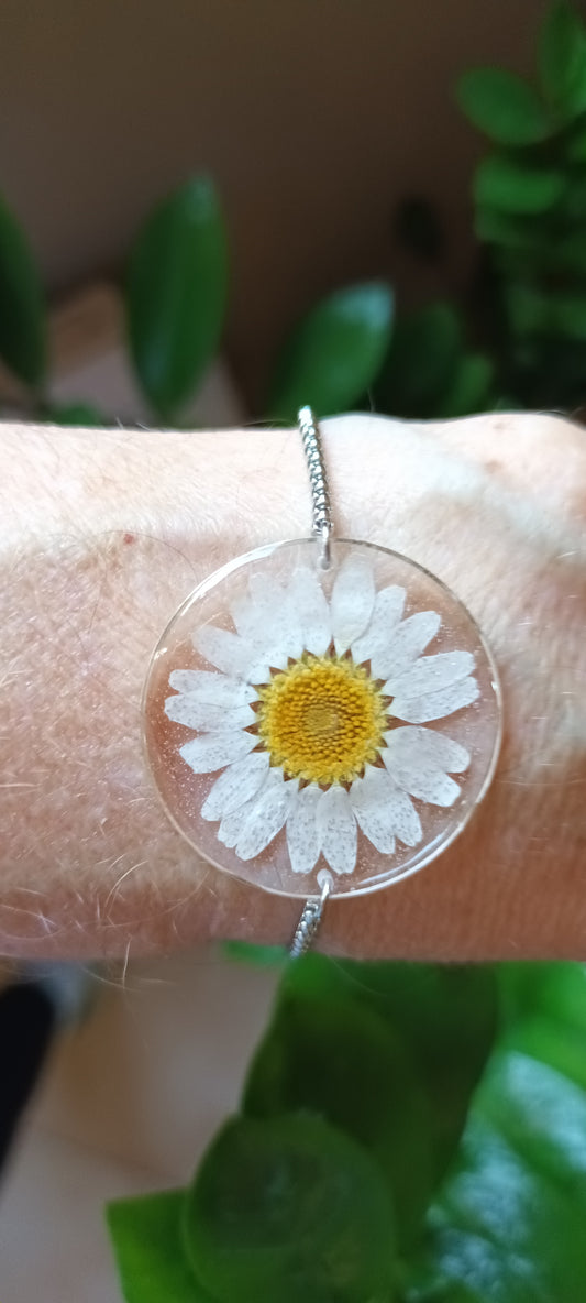 bracelet en résine avec inclusion d'une jolie marguerite pressée