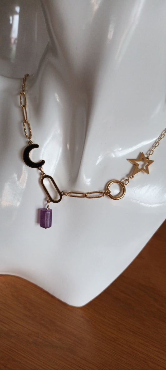 collier en pierres précieuses améthyste et nacre de coquillage fleurs