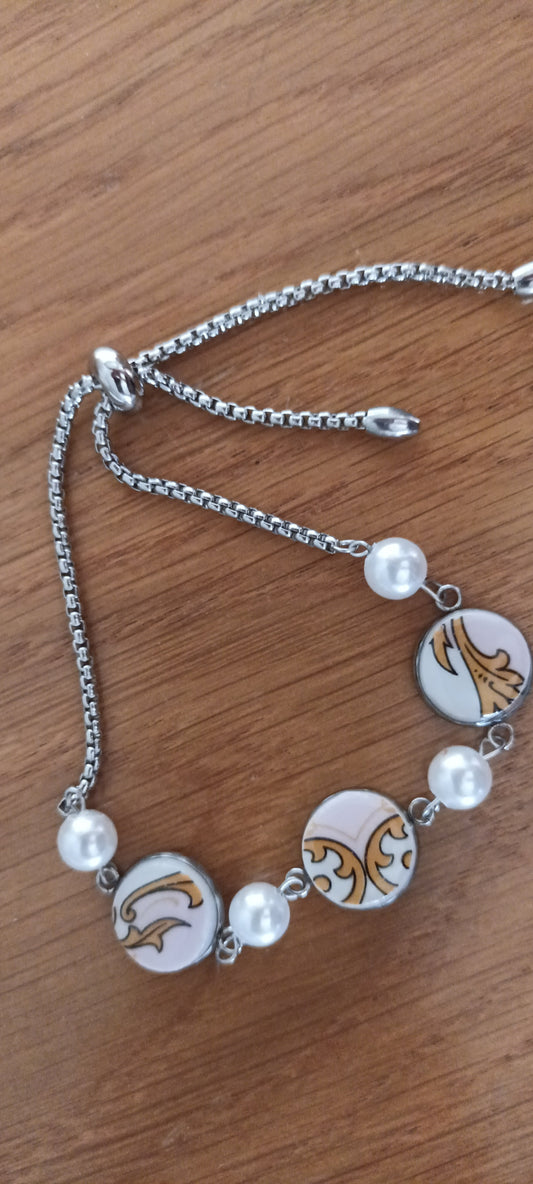 Bracelet en porcelaine de couleurs rose et doré et perles de verres blanches