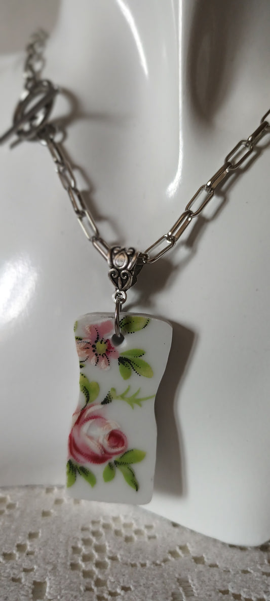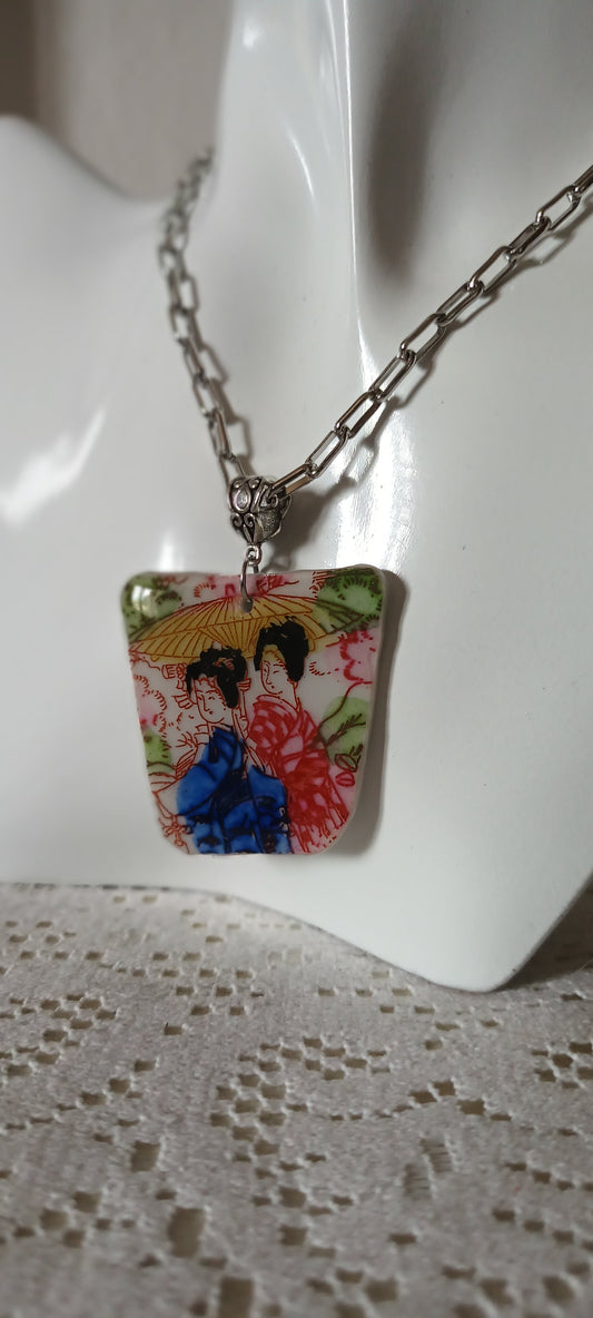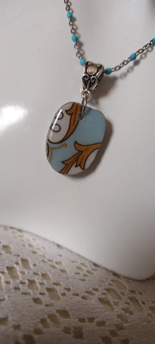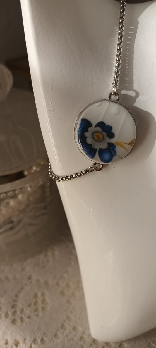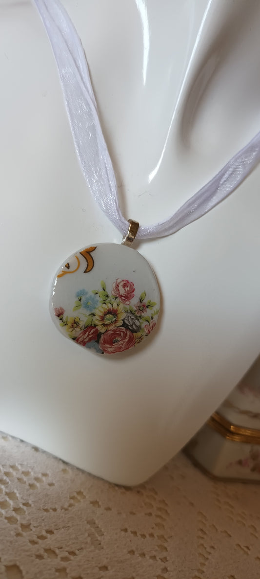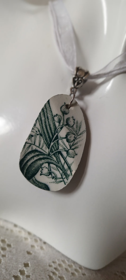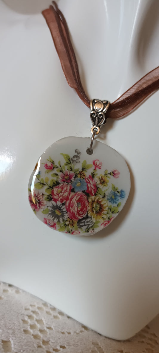 Pendentif fait main inspiré par des motifs floraux, fabriqué a partir d'une ancienne assiette, époque révolue que je fait revivre, chaque bijoux est unique, tout comme la personne qui la portera.