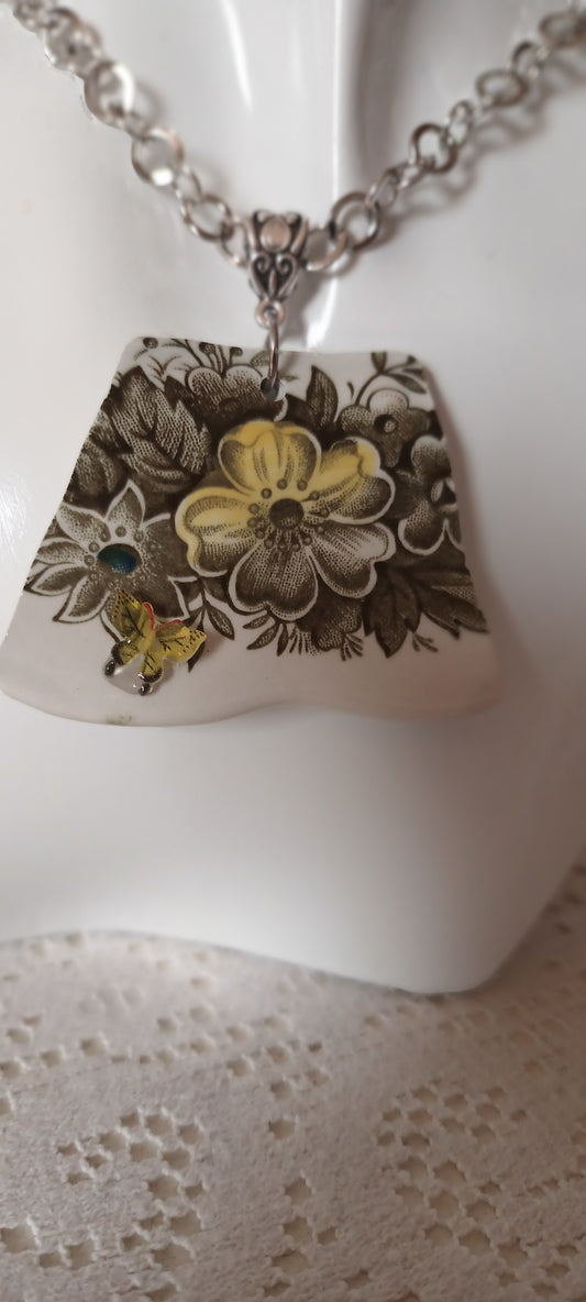Pendentif créé à partir d'une assiette ancienne fleurie jaune et kaki