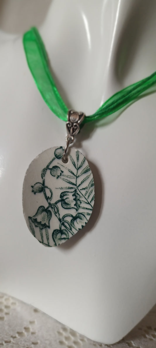 Pendentif créé à partir d'une assiette ancienne fleurie muguet