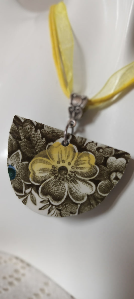 Pendentif créé à partir d'une assiette ancienne fleurie jaune et kaki en demi lune