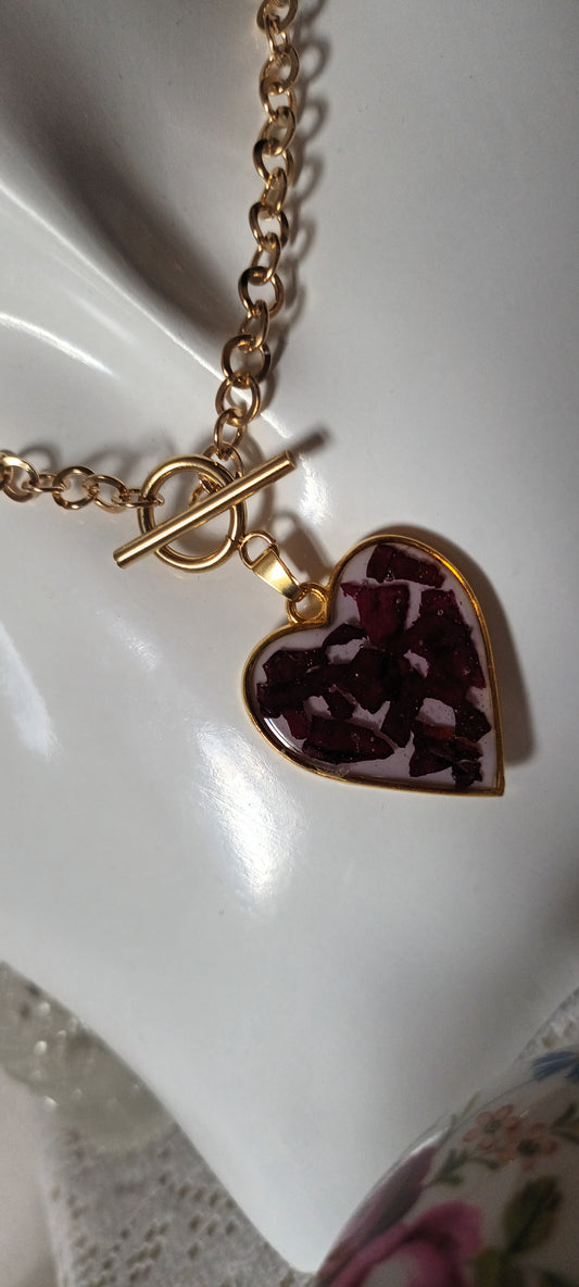 collier en forme de cœur en résine avec inclusion de roses pressées doré