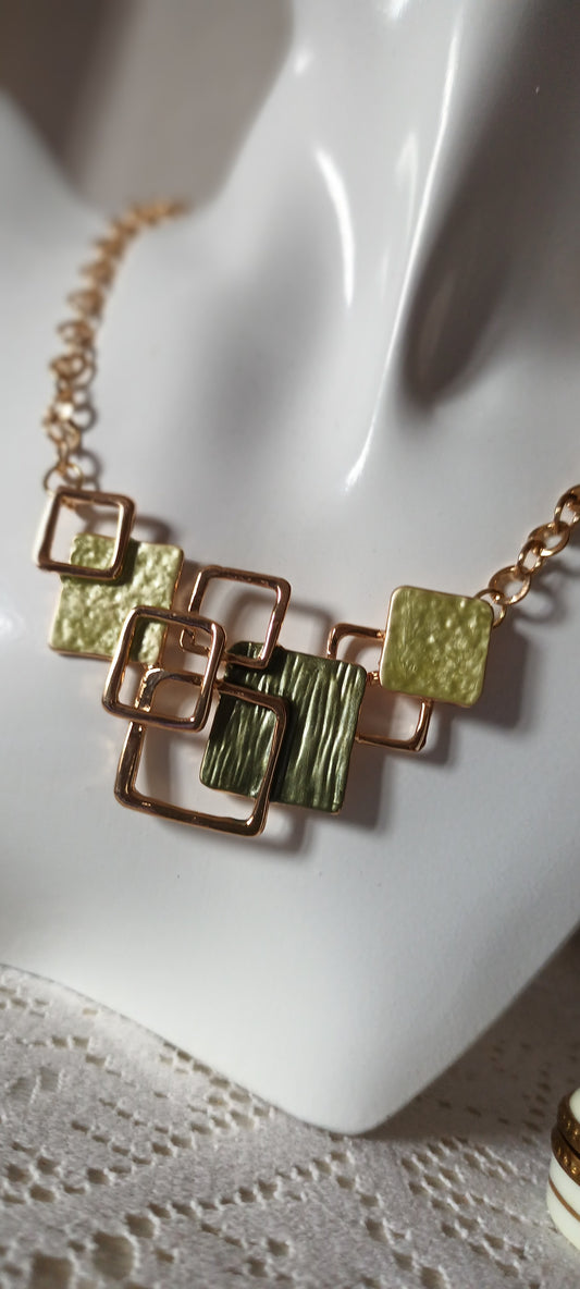ensemble boucles d'oreilles et collier en forme géométrique carré vert en doré