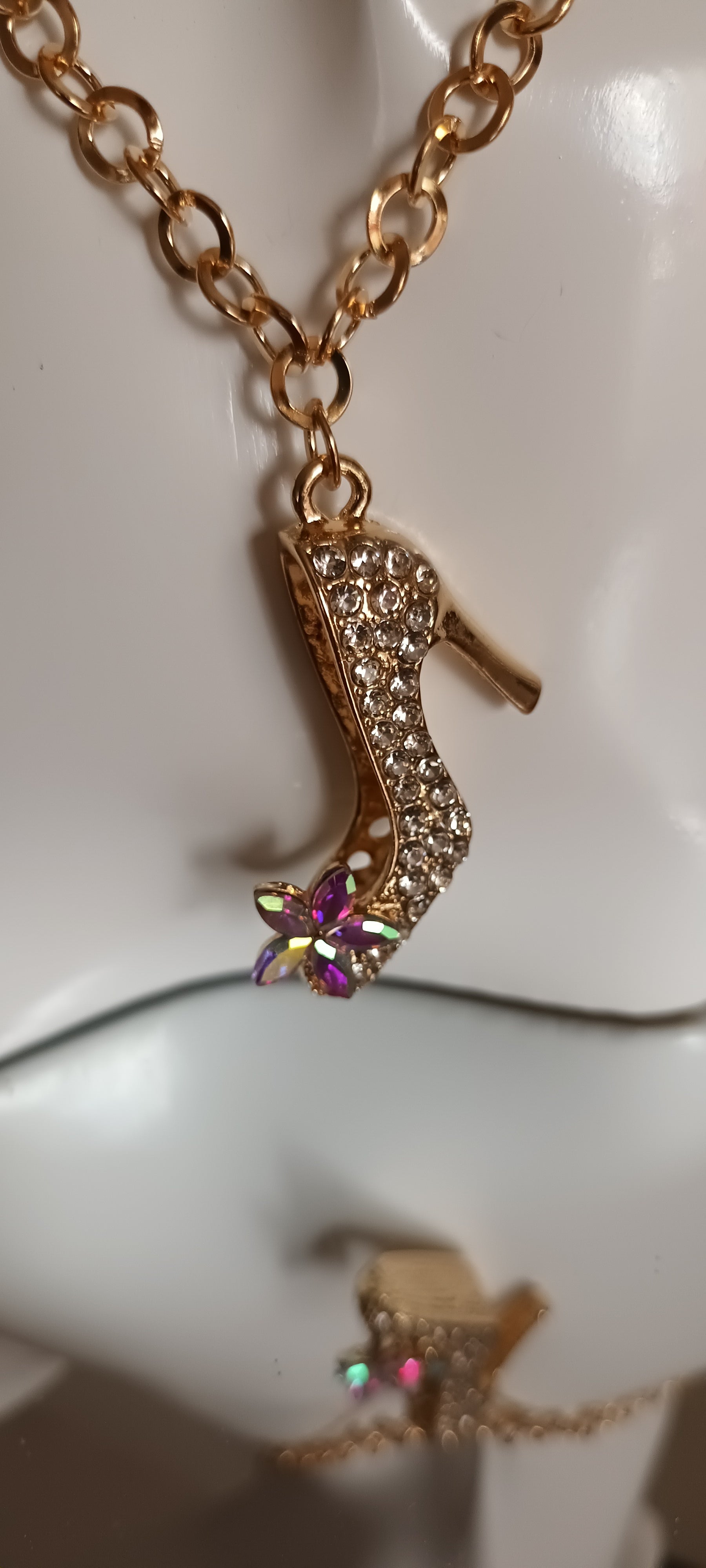 Collier pendentif chaussure à talon avec strass accessoire chic et élégant , détail petite fleur cristaux transparents ,en acier inoxydable ,pour accompagner vos tenues du quotidien