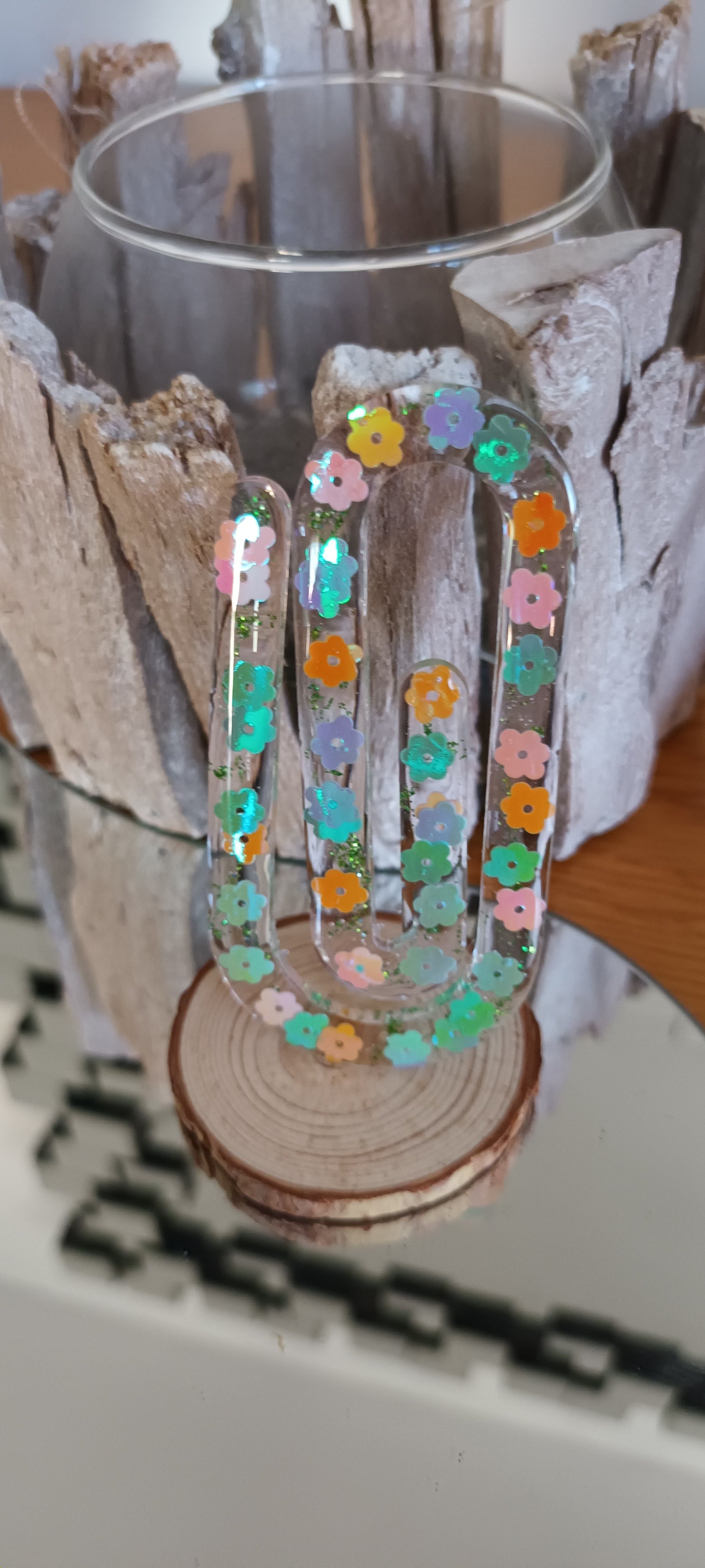Marque page en forme de trombone en résine avec inclusions de petites fleurs de couleurs différentes, ou rose paillettes ou lettres pour joindre l'utile à l'agréable, une jolie idée de cadeau