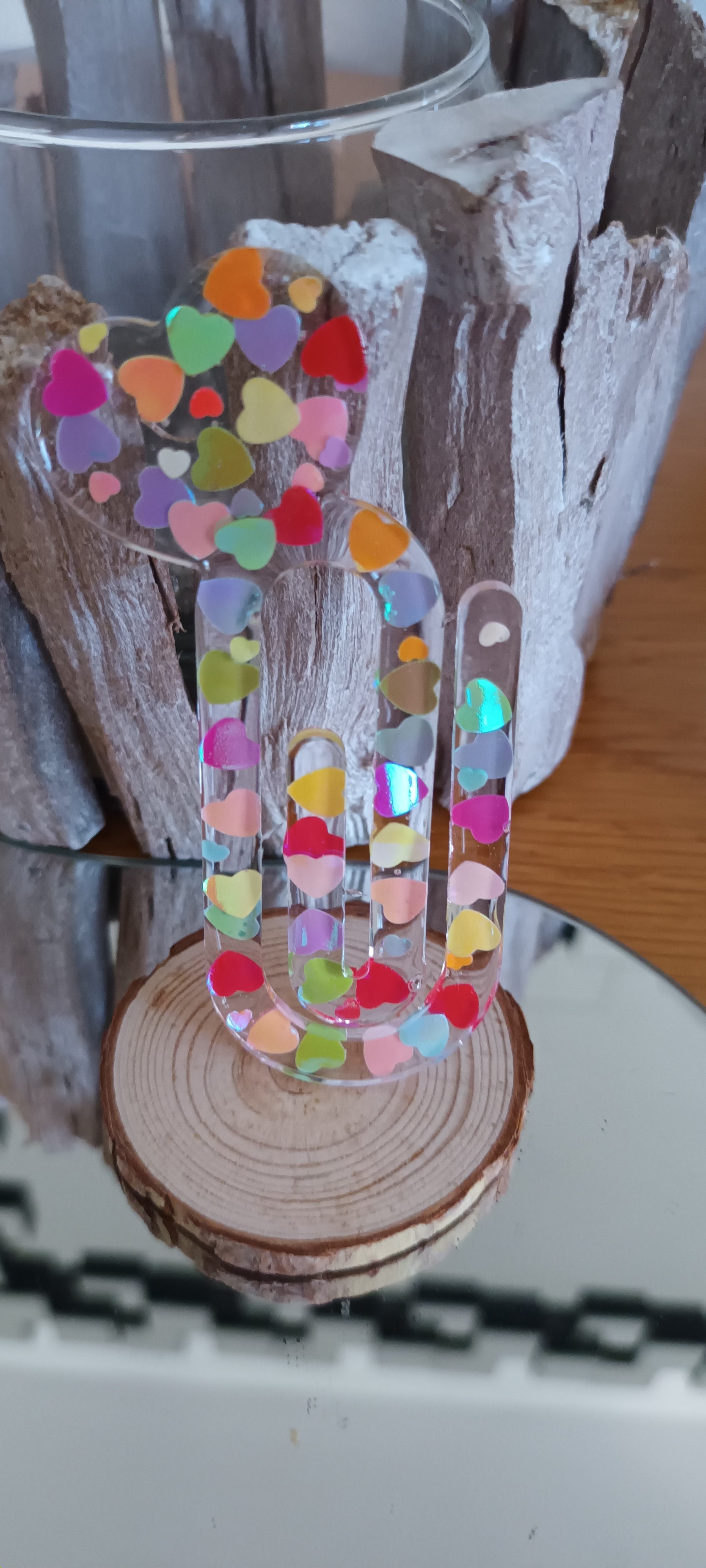 Marque page en forme de trombone en résine avec inclusions de petits cœurs de couleurs différentes, pour joindre l'utile à l'agréable, une jolie idée de cadeau