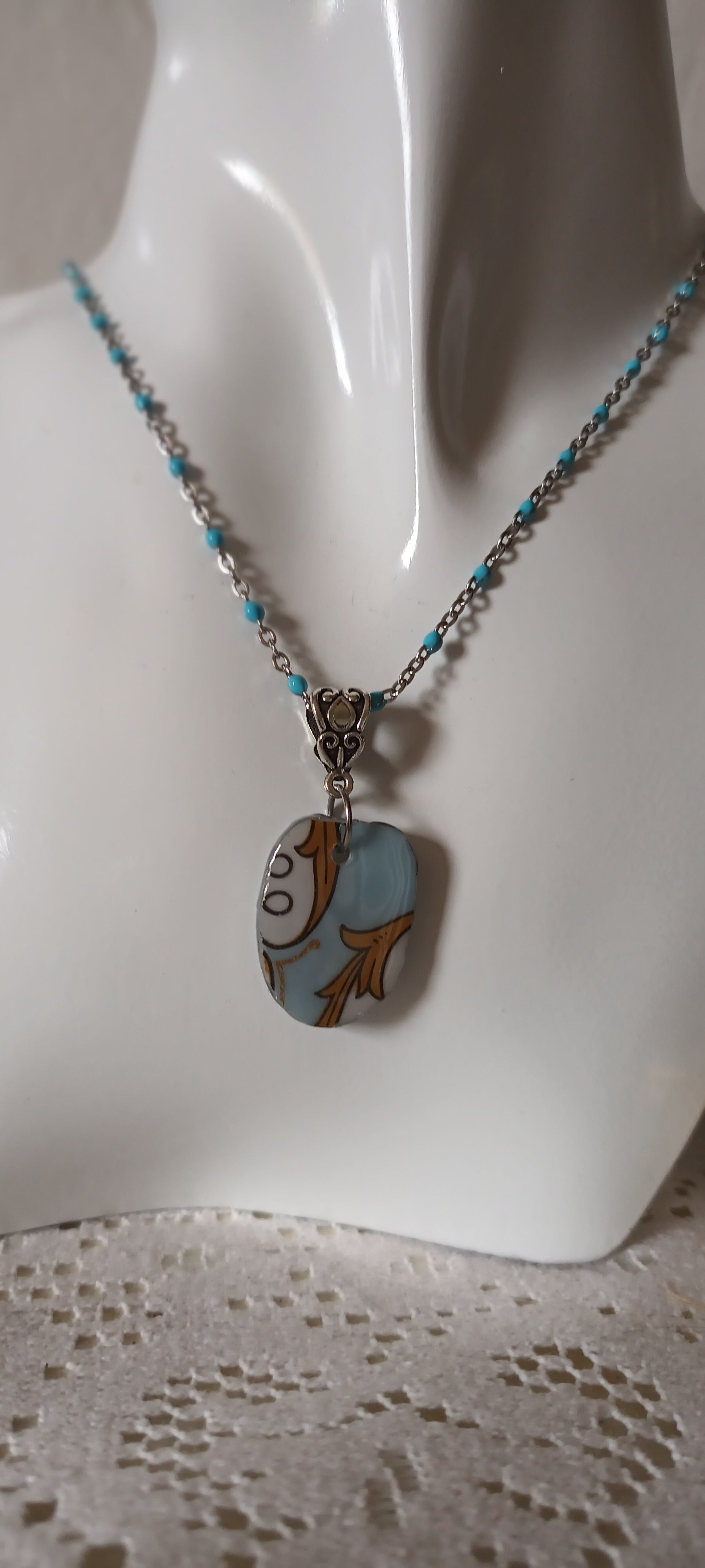 Ce pendentif inspiré de motifs floraux et fabriqué à partir d'une ancienne assiette , portant des souvenirs d'une époque révolue que je fais revivre à travers mes créations. Chaque bijou est unique, tout comme la personne qui la portera.