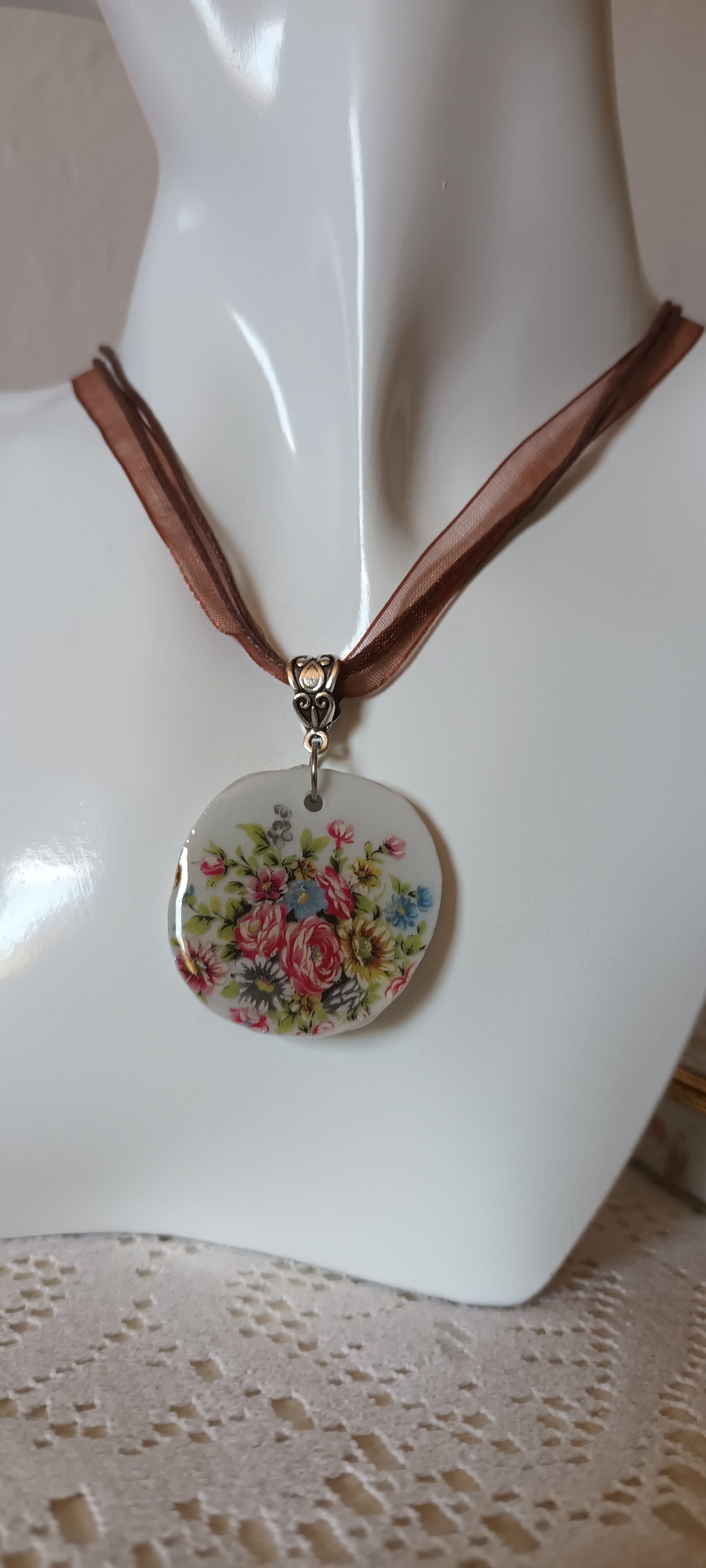 Ce pendentif inspiré de motifs floraux et fabriqué à partir d'une ancienne assiette , portant des souvenirs d'une époque révolue que je fais revivre à travers mes créations. Chaque bijou est unique, tout comme la personne qui la portera.